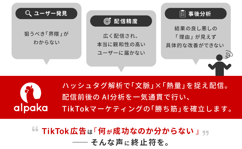 通常のTikTok広告はAIによる自動配信が主流ですが、alpakaは独自のデータを活用し、人間やAI任せでは見つけにくい「隠れた優良ターゲット」を発掘します。